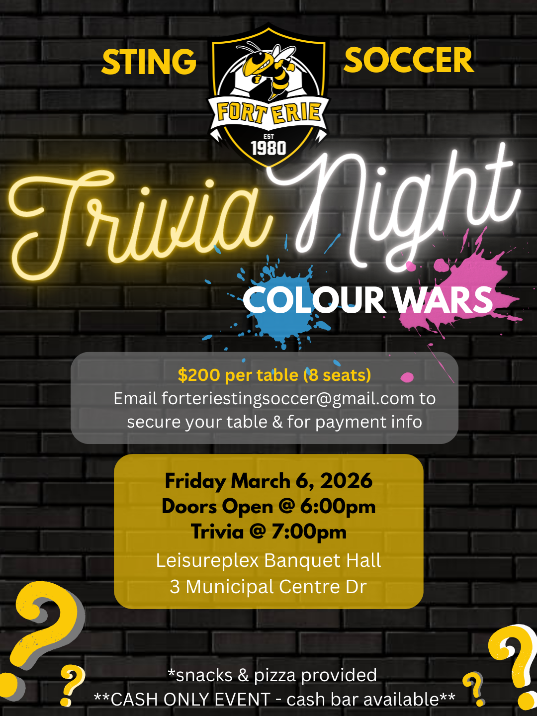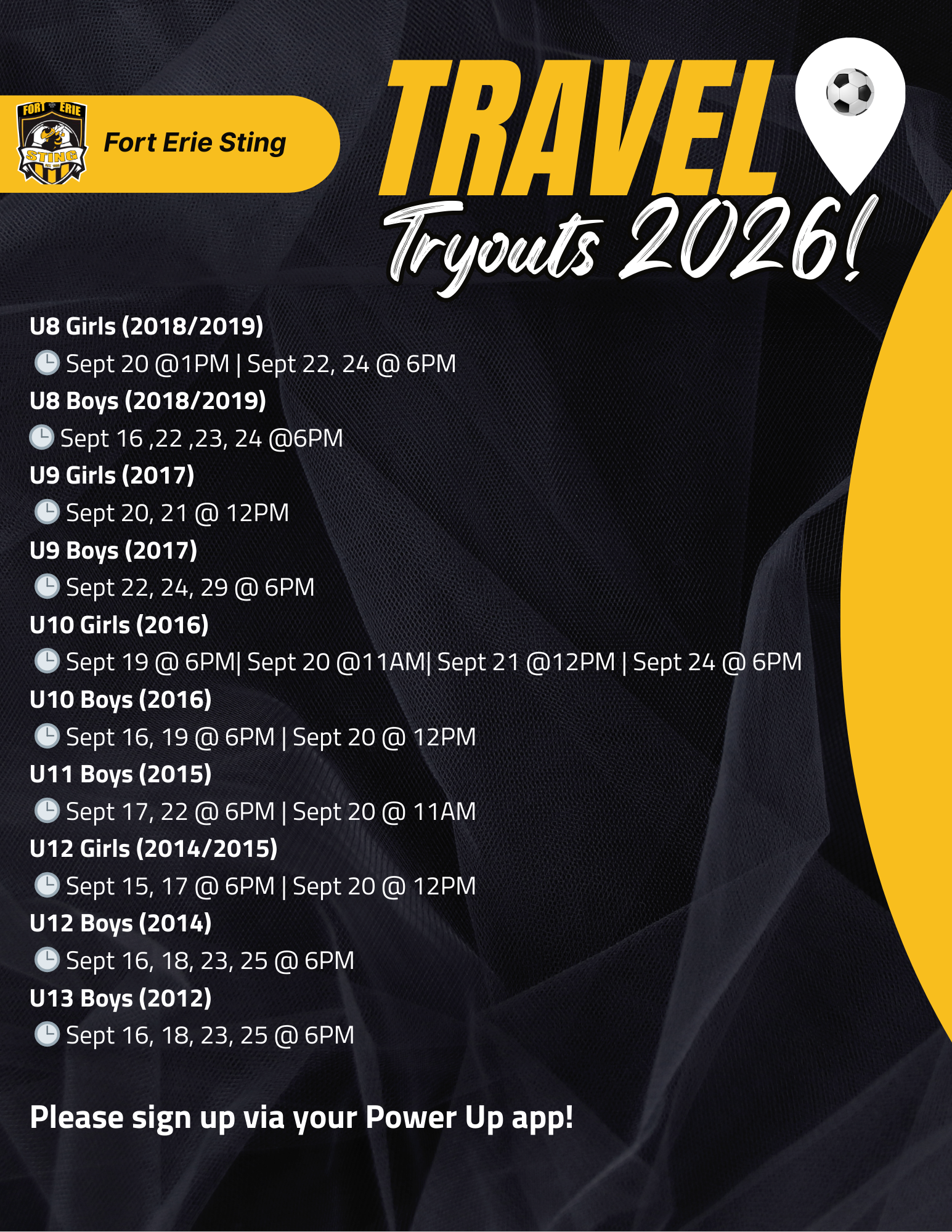 We are excited to announce that travel team tryouts for the Fort Erie Sting travel soccer program will commence April1st, 2025. All tryouts will be held at Greater Fort Erie Secondary School on the turf field. All players interested in trying out must be registered in PowerUp prior to tryouts (either under Travel or House League). Players must wear the proper soccer equipment to tryouts (cleats are recommended, shin guards are a must). Please visit our Travel League page for dates and times.